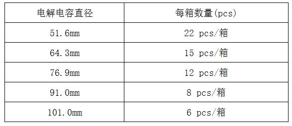 根據電解電容直徑的不同,CECTN電容每箱包裝數量分為下表中六種: