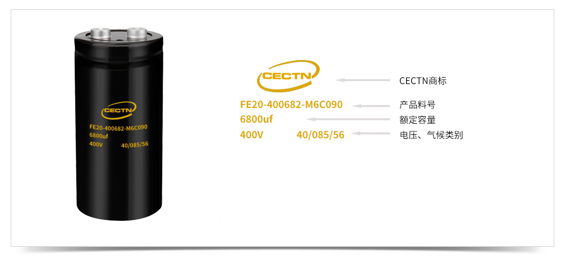 ? ? ? ? 鋁電解電容的料號又兩個部分組成,上面是CECTN商標,下面為電解電容型號,包含訂購代碼、電壓、容量、溫度、壽命、安裝方式等信息。詳細了解請點擊進入《凱琦佳鋁電解電容料號說明》頁面。